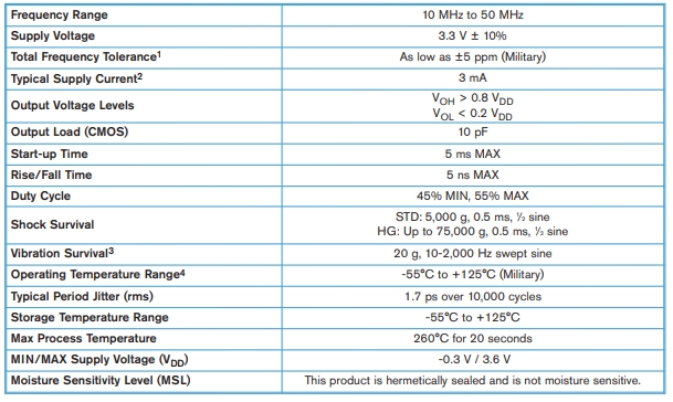 频率稳定度:-40℃~85℃工况下±30ppm~±100ppm可选,-55℃~125℃工况下±50ppm~±100ppm可选,第一年老化±5ppm(根据频率调整);